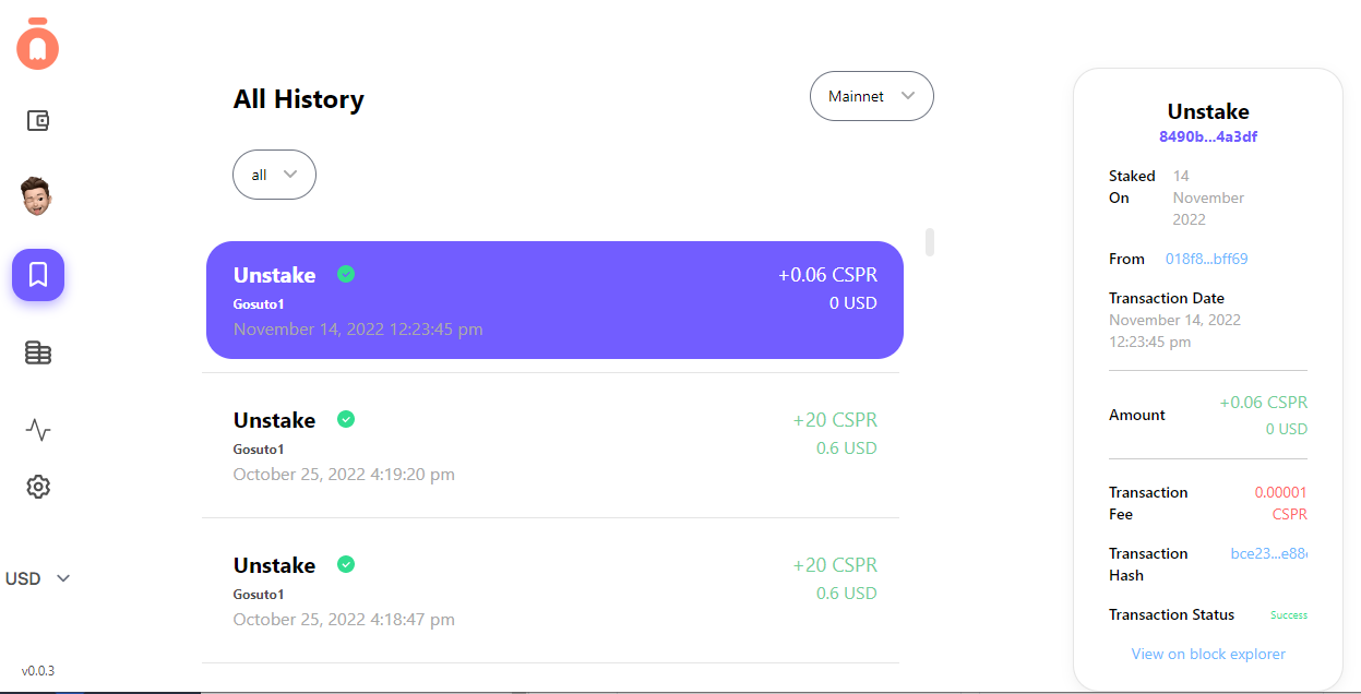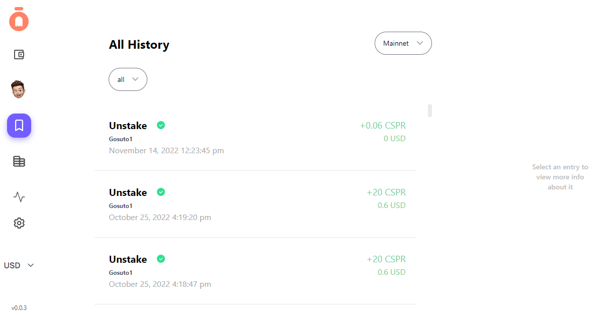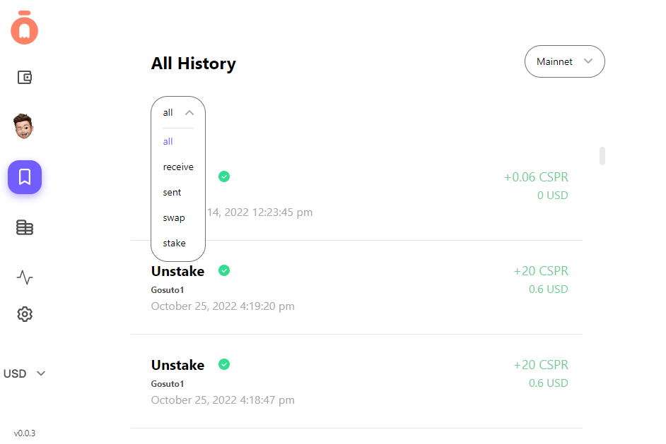 **History** shows you all of the histories of your Gosuto wallet, which includes the history of your wallet on Mainnet and Testnet.