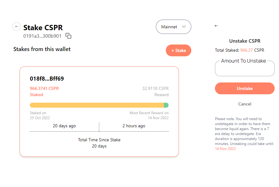 When you click on the **Stake**, an option to **Unstake** appears on the right side.