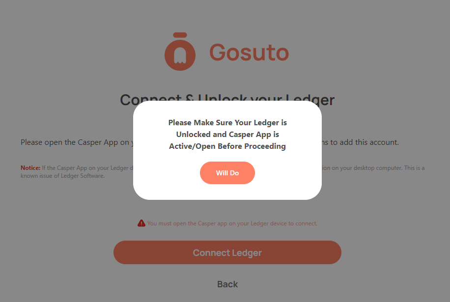 The next Window will have a pop-up message that says **Please Make Sure Your Ledger is Unlocked and Casper App is Active/Open Before Proceeding.**<br>