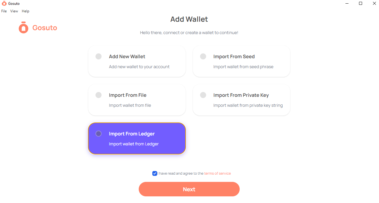 Once you select **Import From Ledger** make sure to read and agree to the Terms of Service, after that click **Next**.<br>